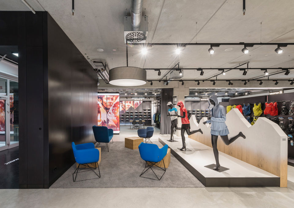 Durch die Verwendung von schwarzem Metall und Beton im Kontrast zu weichen Naturmaterialien wie Holz entsteht eine eindrucksvolle Rauminszenierung. Alleinstehende Lichtboxen ermöglichen das optische Hervorheben aktueller Kollektionsstücke. Gleichzeitig bieten diese Präsentationsflächen eine optimale Plattform für Key Visuals zur Emotionalisierung der Sportart und deren Artikel.